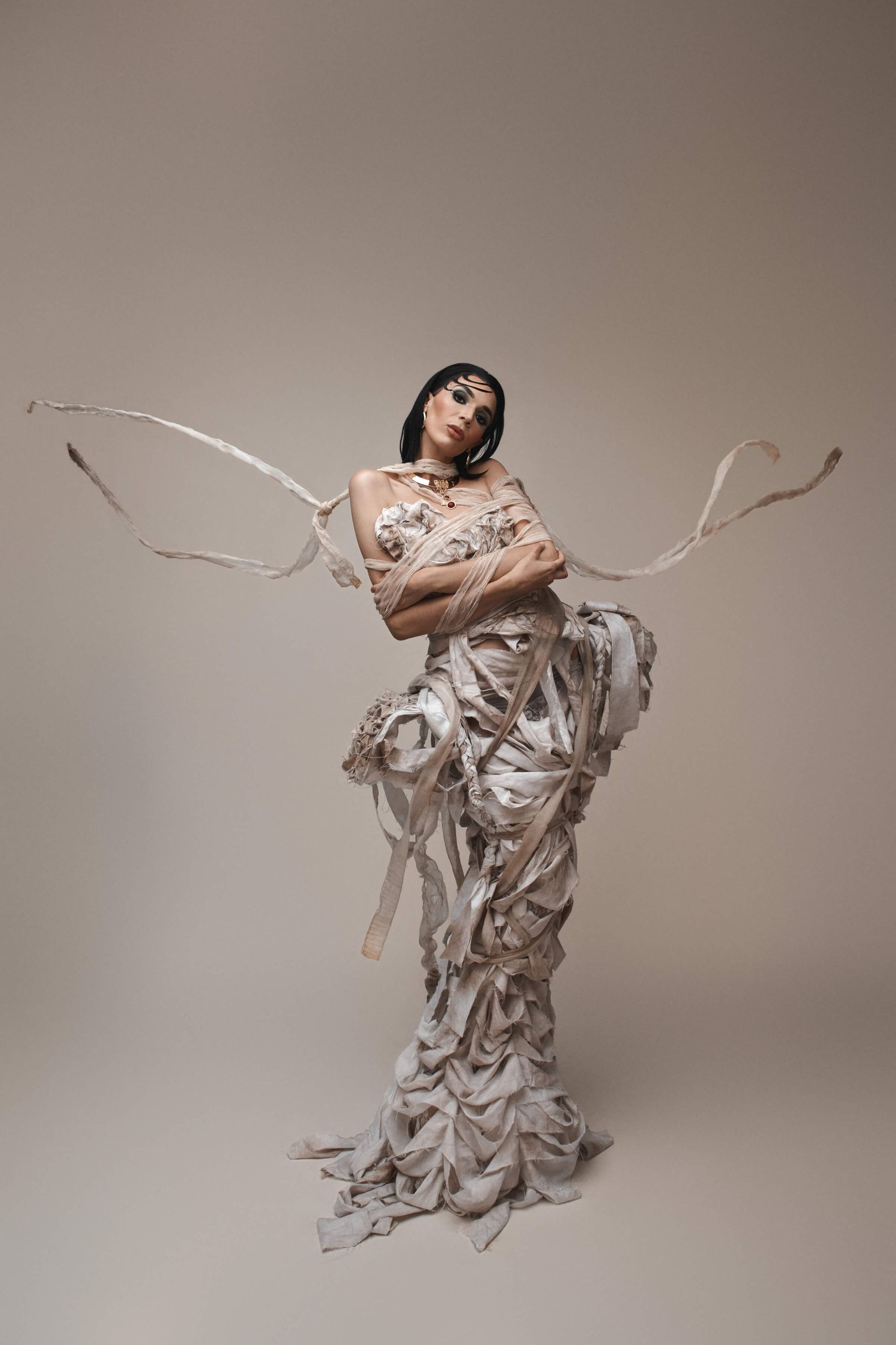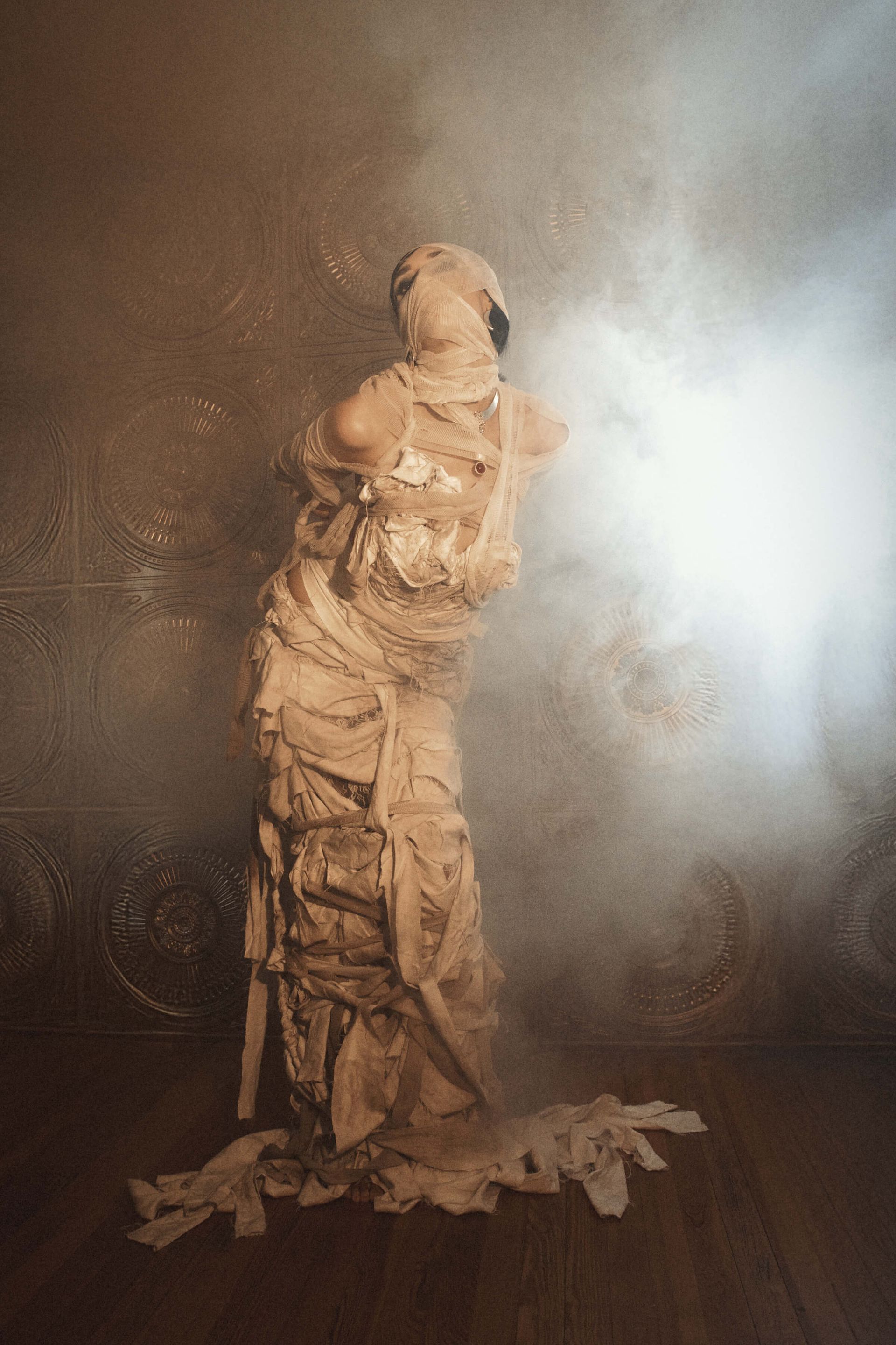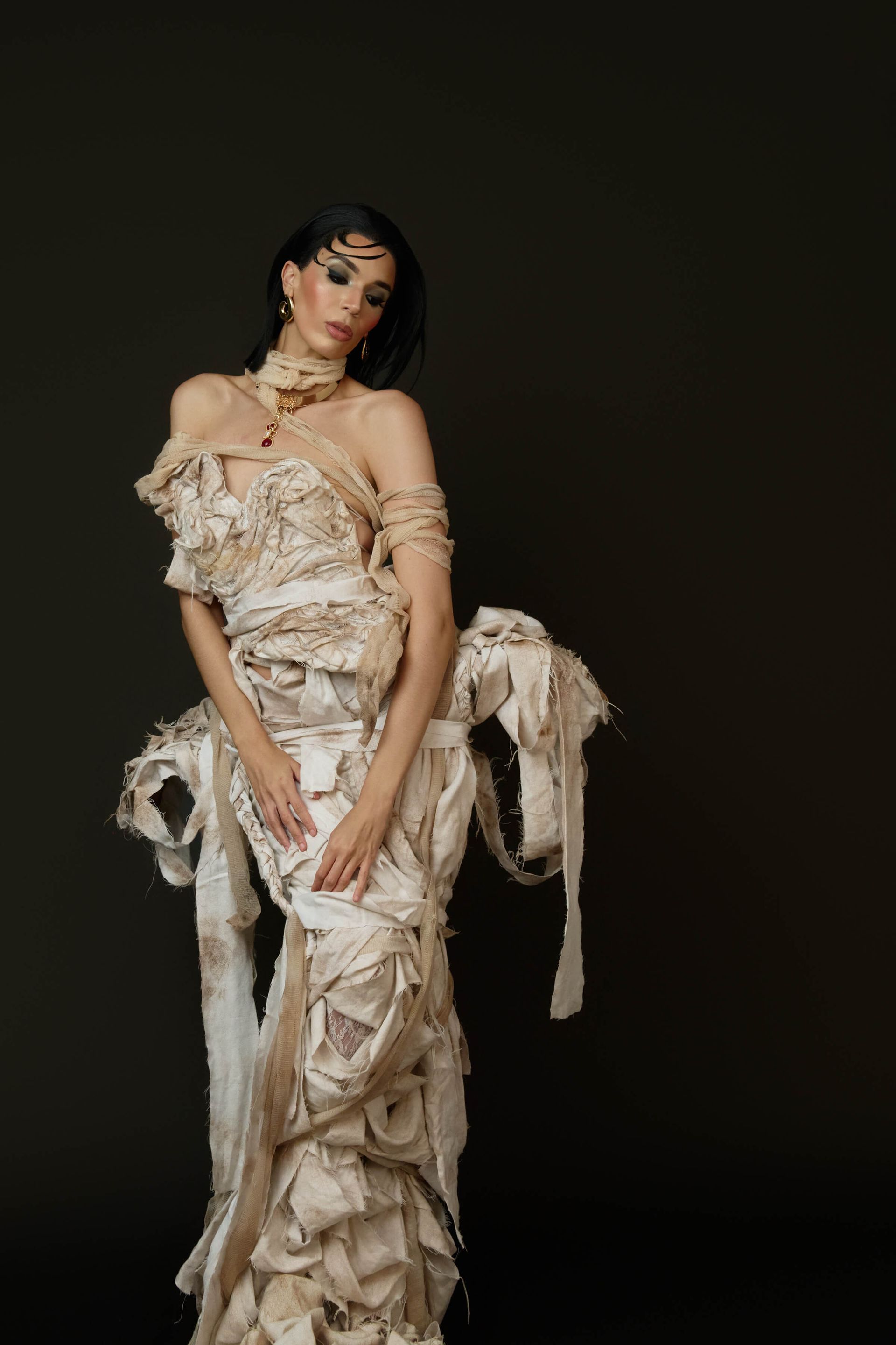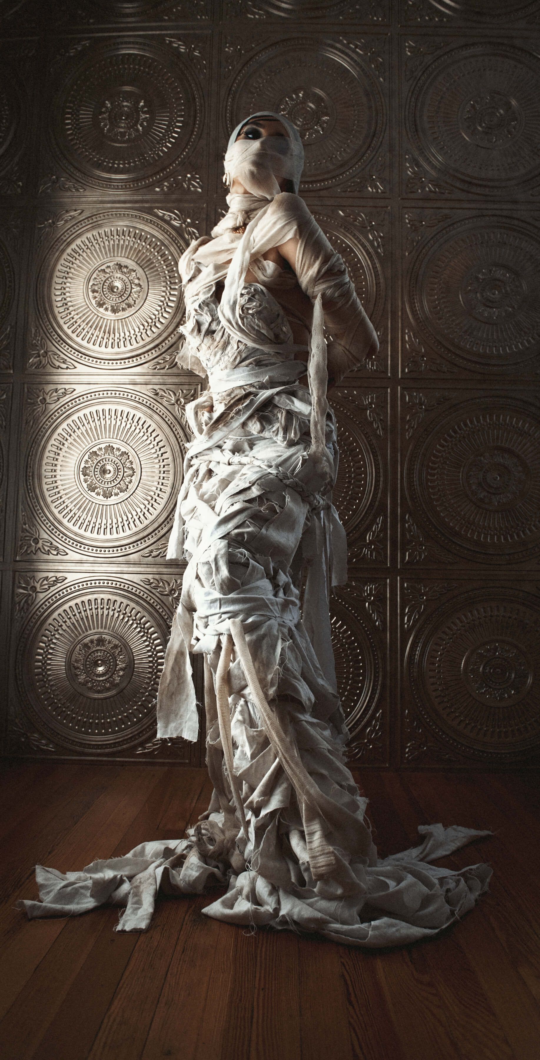 We actually shot the story in reverse, to capture the full glam and full gown first. Then we partially wrapped up the gown and the model's arms with more strips of bedsheet and gauze, and finally shot the fully wrapped look last.