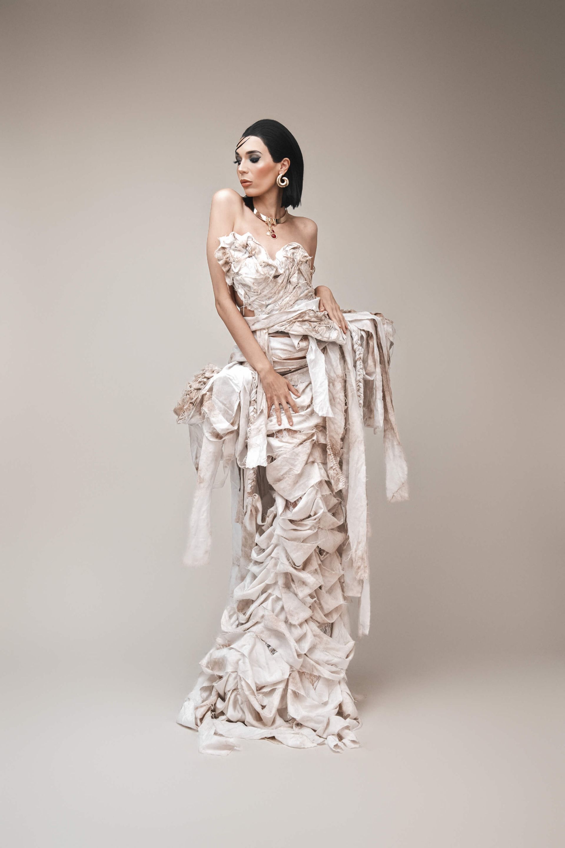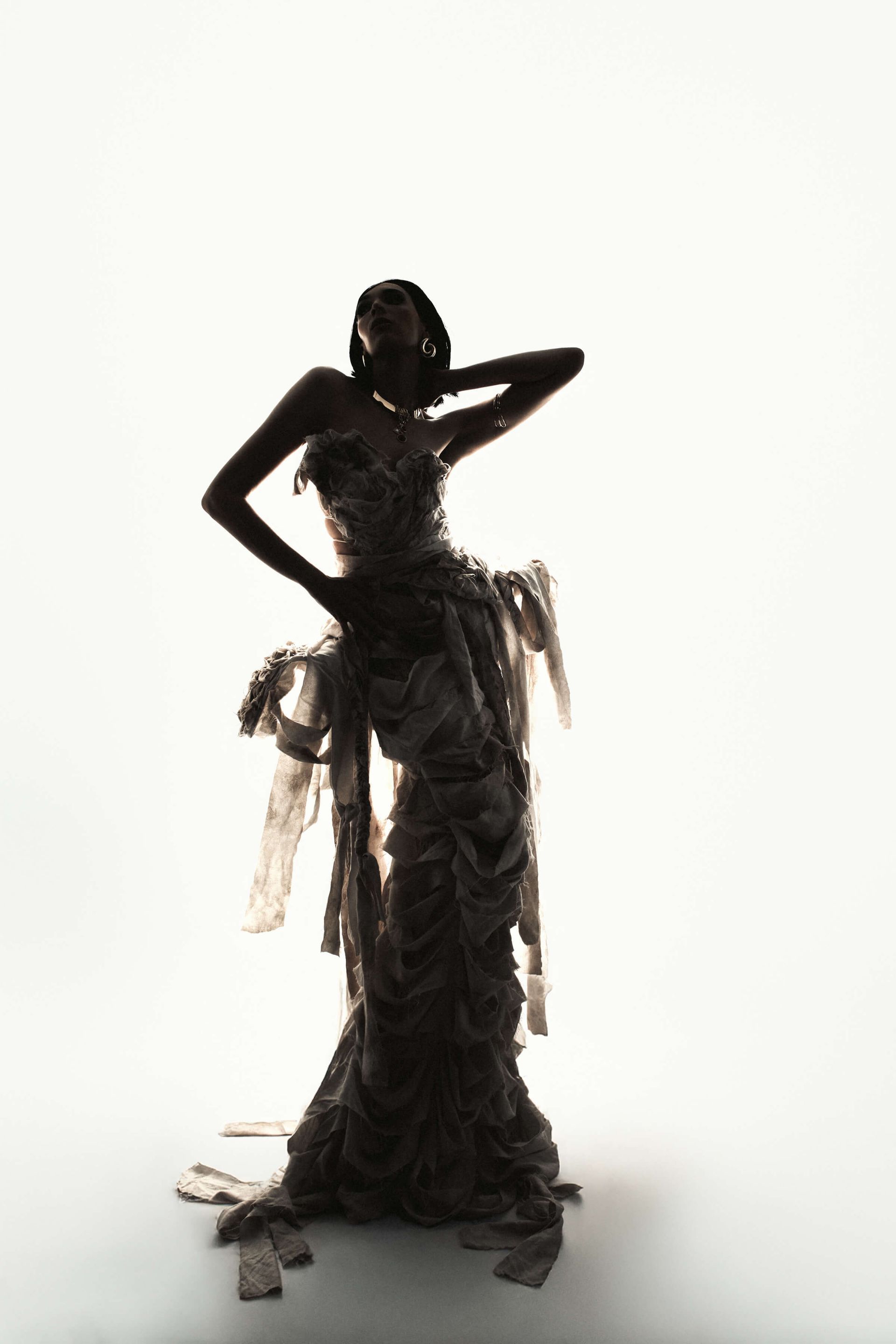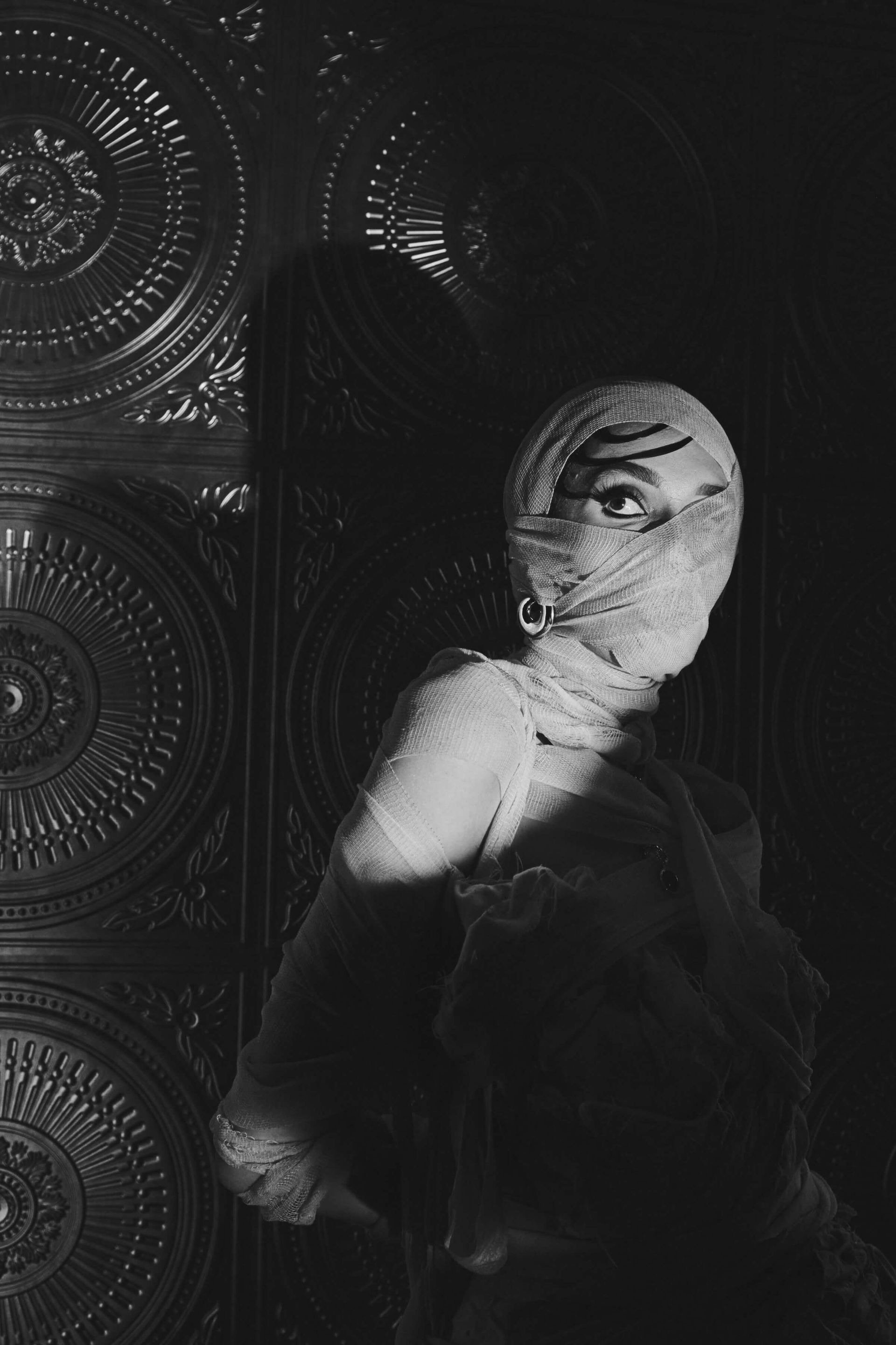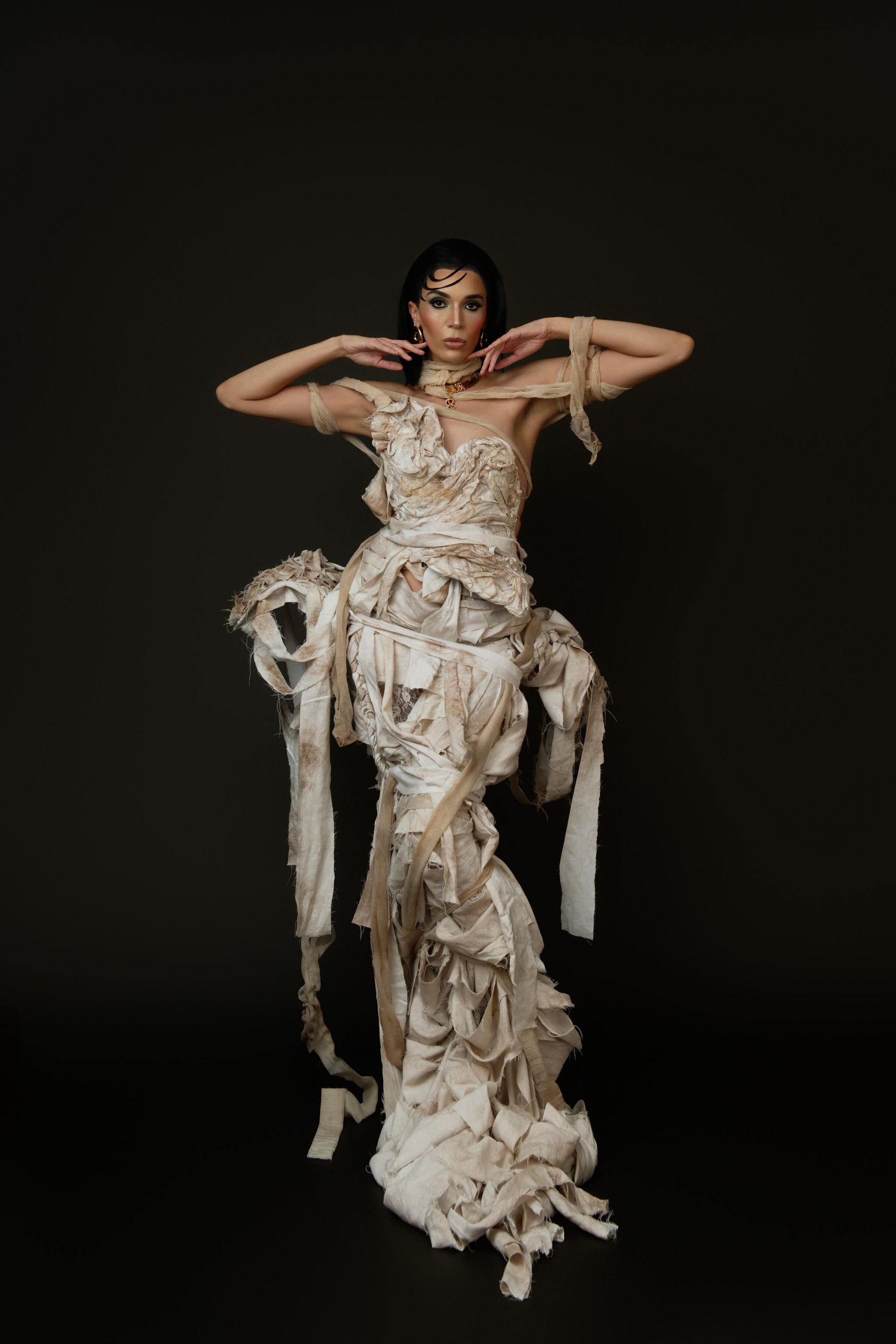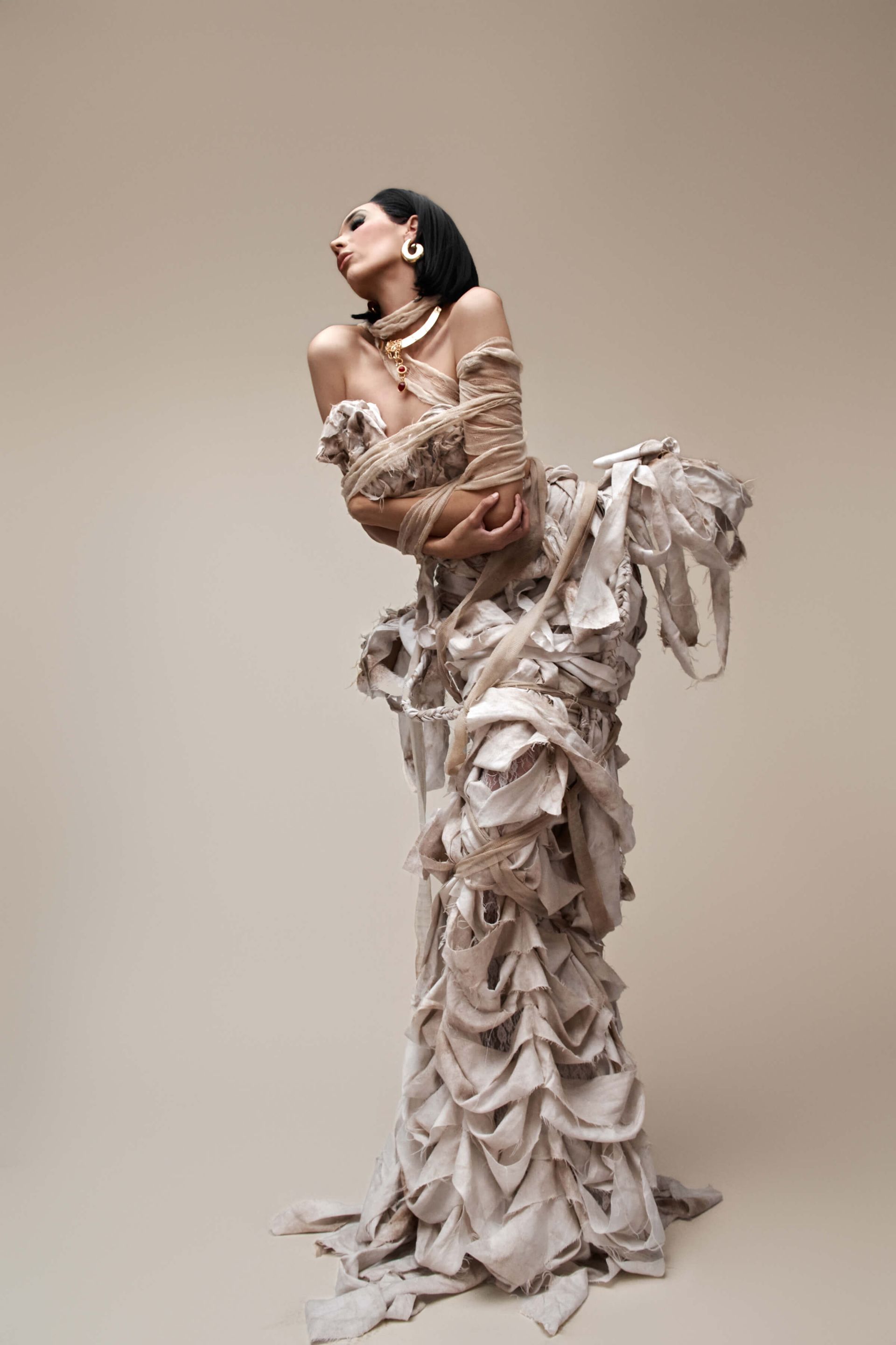 We actually shot the story in reverse, to capture the full glam and full gown first. Then we partially wrapped up the gown and the model's arms with more strips of bedsheet and gauze, and finally shot the fully wrapped look last.