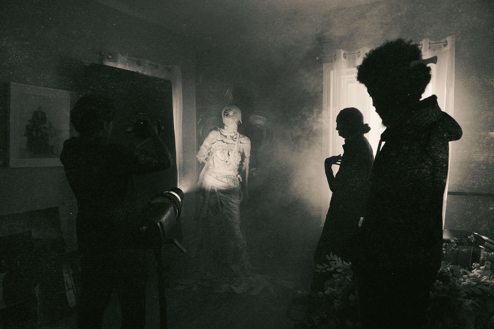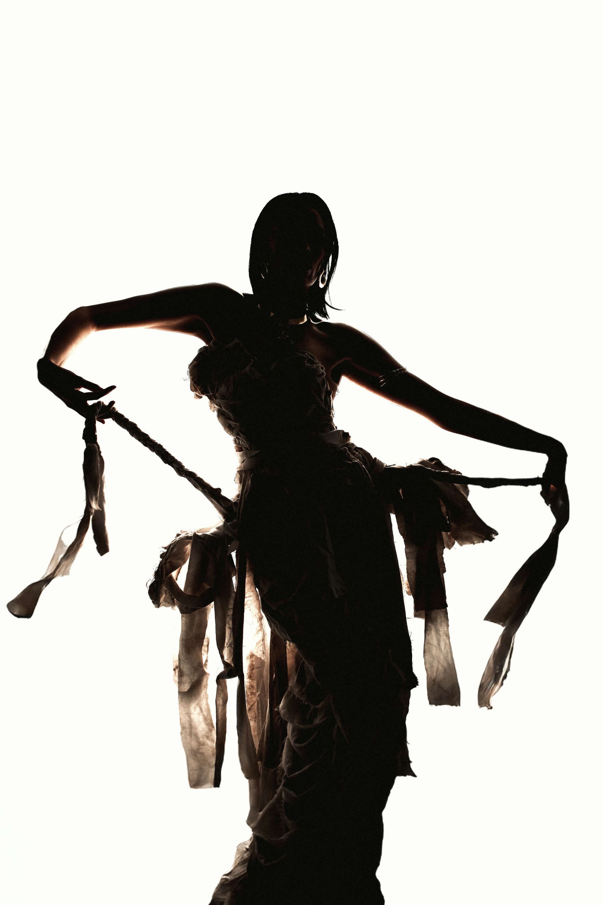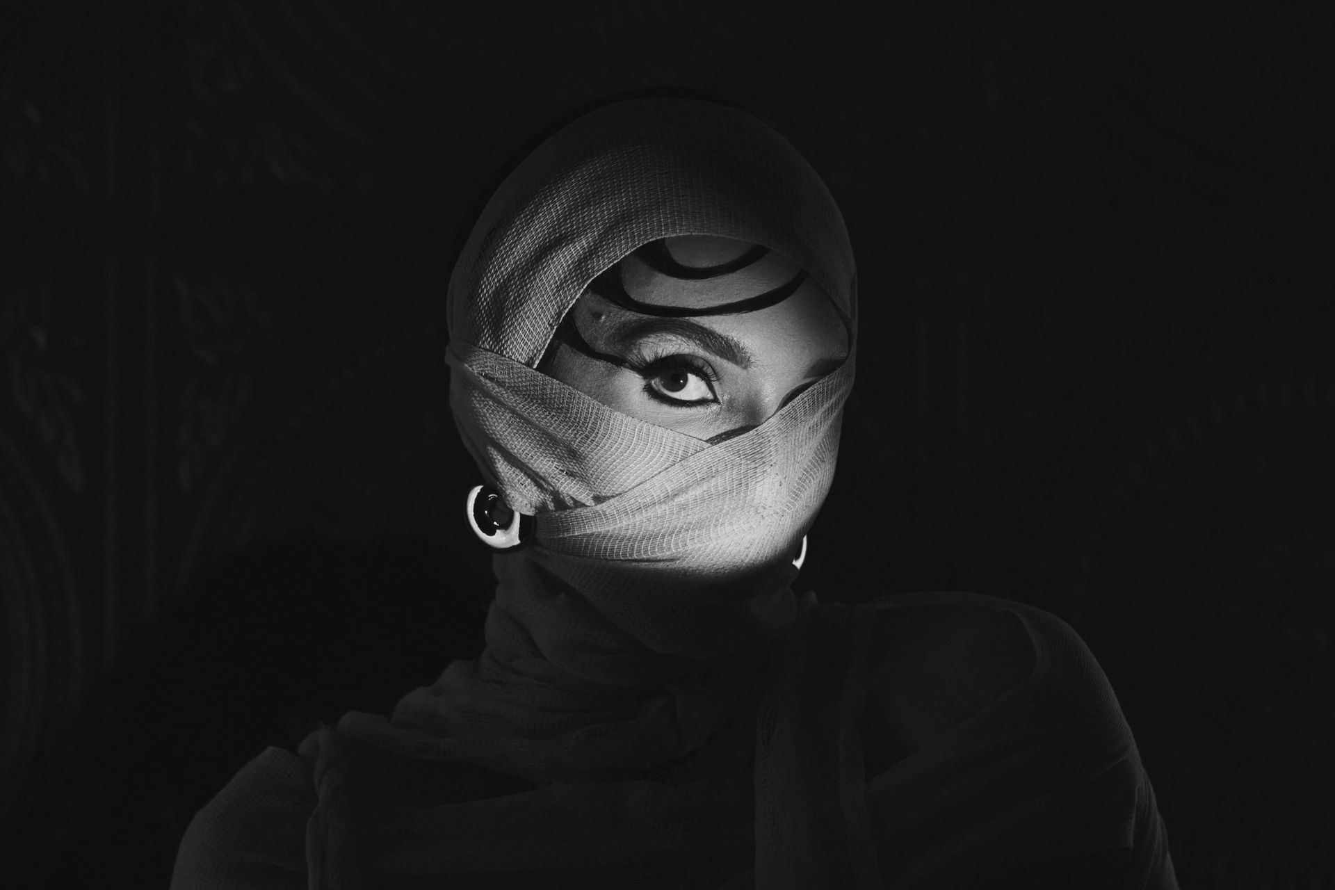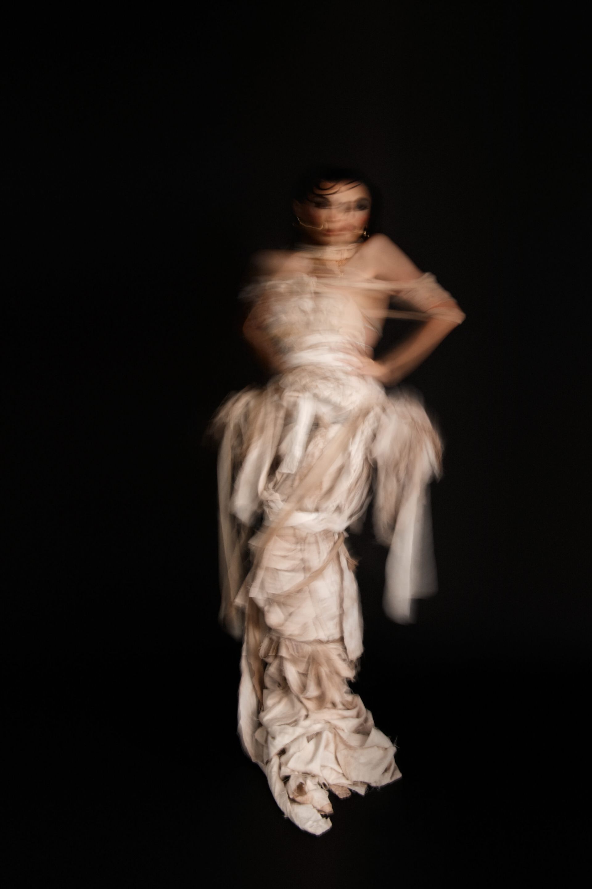 We actually shot the story in reverse, to capture the full glam and full gown first. Then we partially wrapped up the gown and the model's arms with more strips of bedsheet and gauze, and finally shot the fully wrapped look last.